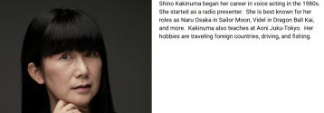 Shino Kakinuma began her career in voice acting in the 1980s. She started as a radio presenter. She is best known for her roles as Naru Osaka in Sailor Moon, Videl in Dragon Ball Kai, and more. Kakinuma also teaches at Aoni Juku-Tokyo. Her hobbies are traveling foreign countries, driving, and fishing. | |