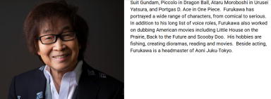 Toshio Furukawa began his career in voice acting in the 1960s. He is best known for his roles as Kai Shiden in Mobile Suit Gundam, Piccolo in Dragon Ball, Ataru Moroboshi in Urusei Yatsura, and Portgas D. Ace in One Piece. Furukawa has portrayed a wide range of characters, from comical to serious. | |